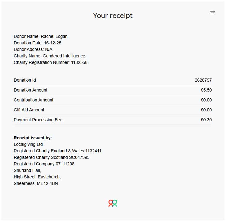 My donation report to Gendered Intelligence for £5.50.