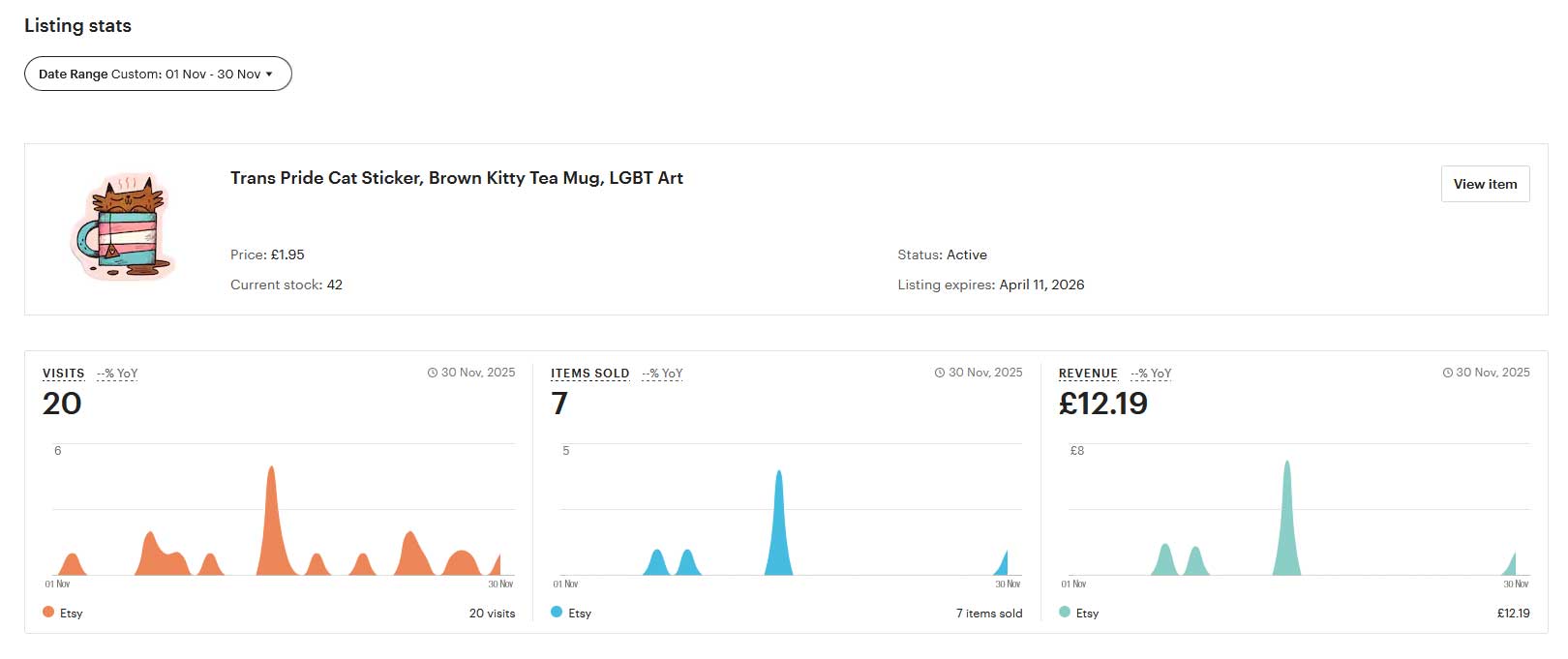 In the same timespan I made seven sales on my Etsy listing, and one private Etsy listing sale which isn't included in these stats, so eight altogether: