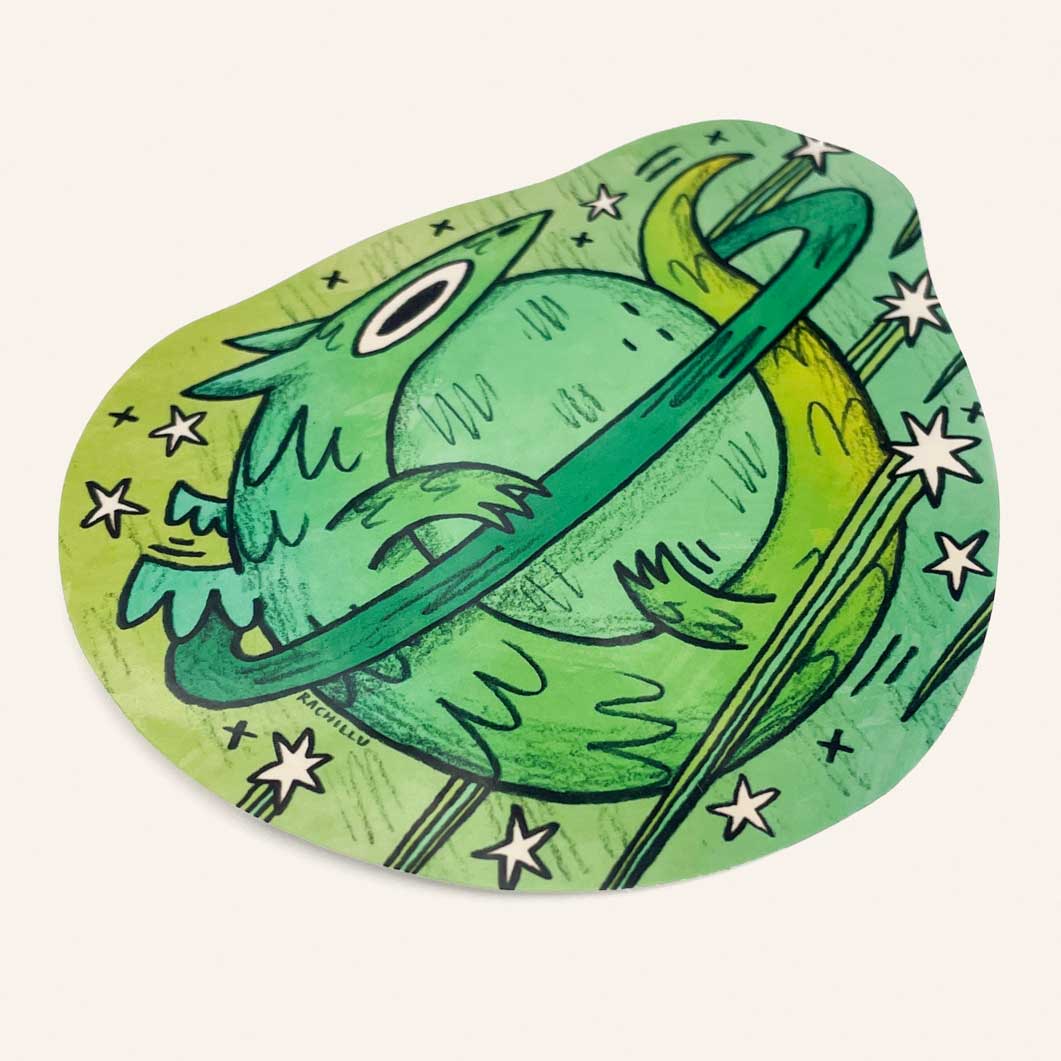 A large glossy sticker featuring a cute little green dragon hugging a ringed planet while shooting stars fly by.